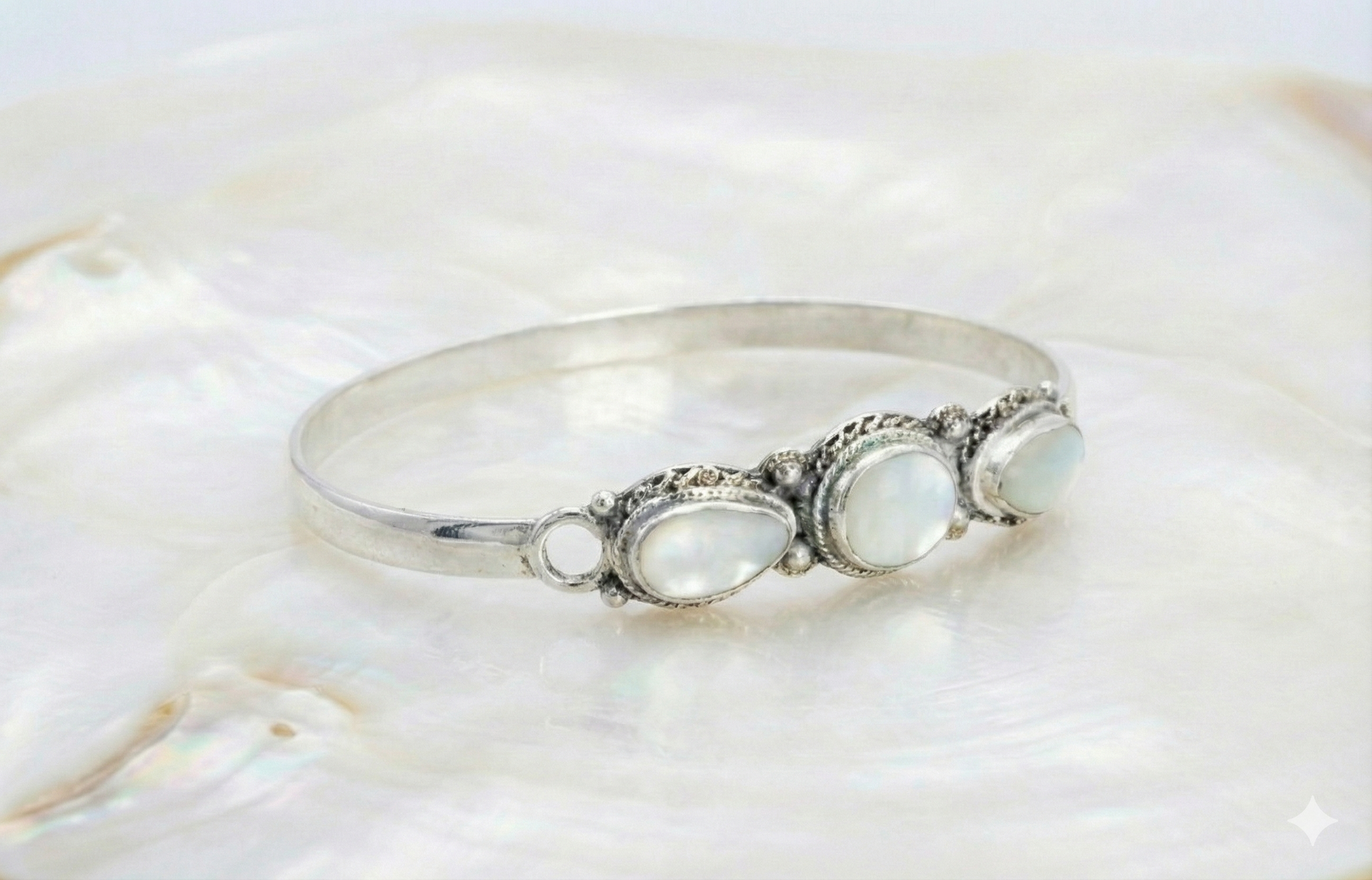 Silver-toned alloy with silver plating and mother-of-pearl-inspired stones — artisan-made for a refined, luxurious finish.